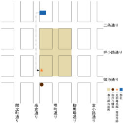 なお、この地は平安京の条坊表示では左京三条四坊七町にあたり、歌人として著名な右大臣藤原定方(八七三~九三二)の邸宅「大西殿〔おおにしどの〕」があったことでも知られている。後にこの邸宅は冷泉天皇皇后昌子〔まさこ〕内親王(九五〇~九九九)の御所となった。紫式部が『源氏物語』で描く藤壺中宮〔ふじつぼちゅうぐう〕とその御所三条宮〔さんじょうのみや〕は、昌子内親王と大西殿をモデルのひとつとした可能性が高い。